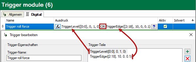 Der Ausdruck eines Triggers besteht aus einem oder mehreren Teilen. Jeder dieser Teile ist wiederum selbst ein Ausdruck. Diese Teile werden zusammengefügt über die Funktion OR. Dadurch ist der Trigger = 1 (TRUE), wenn einer seiner Teile = 1 (TRUE) ist.