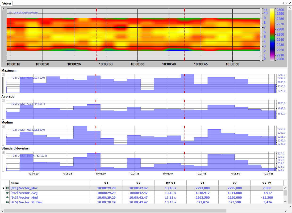 Darunter sind vier Trends mit den berechneten Werten Maximum, Mittelwert, Median und Standardabweichung aus dem Vektor-Berechnungsmodul zu sehen. Die stufenförmige Darstellung der berechneten Werte resultiert aus der Tatsache, dass die Temperaturwerte nur im Sekundentakt erfasst werden.