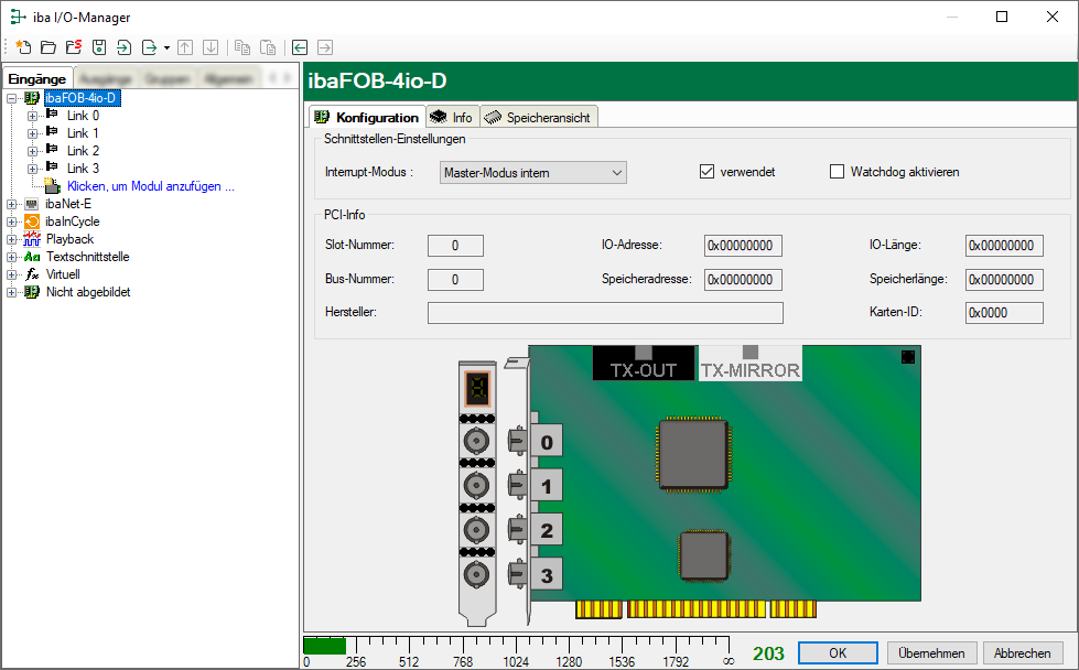 Dies trifft auf alle Varianten der Karte wie ibaFOB-io-D, ibaFOB-2io-D, ibaFOB-4io-D ( FOB4i-D + FOB-4o-D) und respektive auf die Typen PCI und PCIe zu. ibaFOB-…-Dexp ist die Variante für PCI Express.