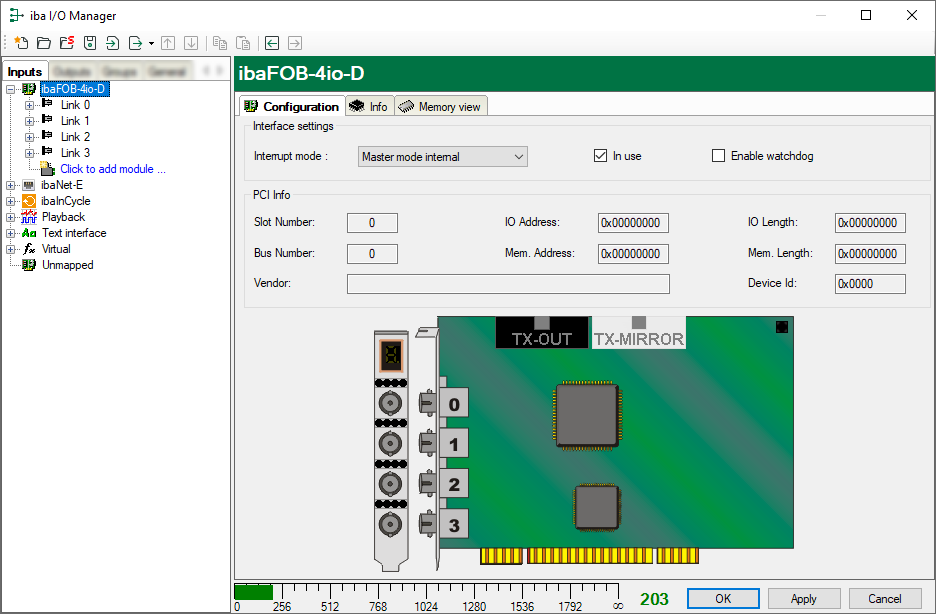 If you select the ibaFOB-…-D interface in the tree structure of the ibaPDA I/O Manager, then a simple presentation of the card is displayed in the Configuration tab in the right part of the dialog.