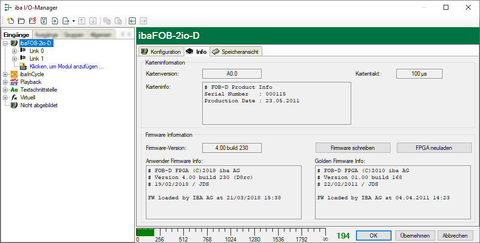 Für die älteren Kartentypen ibaFOB-F, ibaFOB-S und ibaFOB-X sowie für ibaFOB-TDC, ibaFOB-SD und ibaCom-L2B gibt es ein Info-Register auf Kartenebene, das etwas anders aussieht. Gezeigt wird die aktuell geladene Firmware-Version auf den verschiedenen Prozessoren. Auch besteht die Möglichkeit, die Firmware in die Karte zu laden. Mit dem Button <Firmware schreiben> öffnet sich der Dialog "Firmware laden".