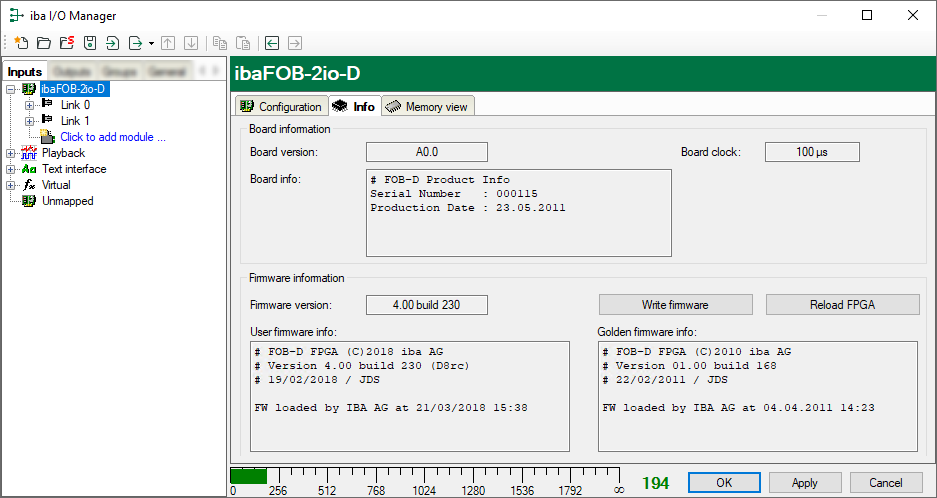 On the Info tab, you can see information about the board and the loaded firmware. Service and support functions, such as reloading the FPGA and updating the firmware, are available on this tab.