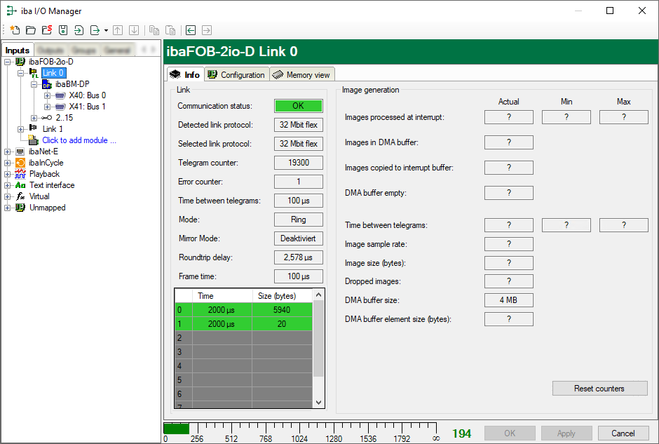 The information on the right side of the dialog describes the image generation. An image is a collection of bytes that the board writes into the computer system memory via DMA. This image contains all the data of the measurement signals from that link.