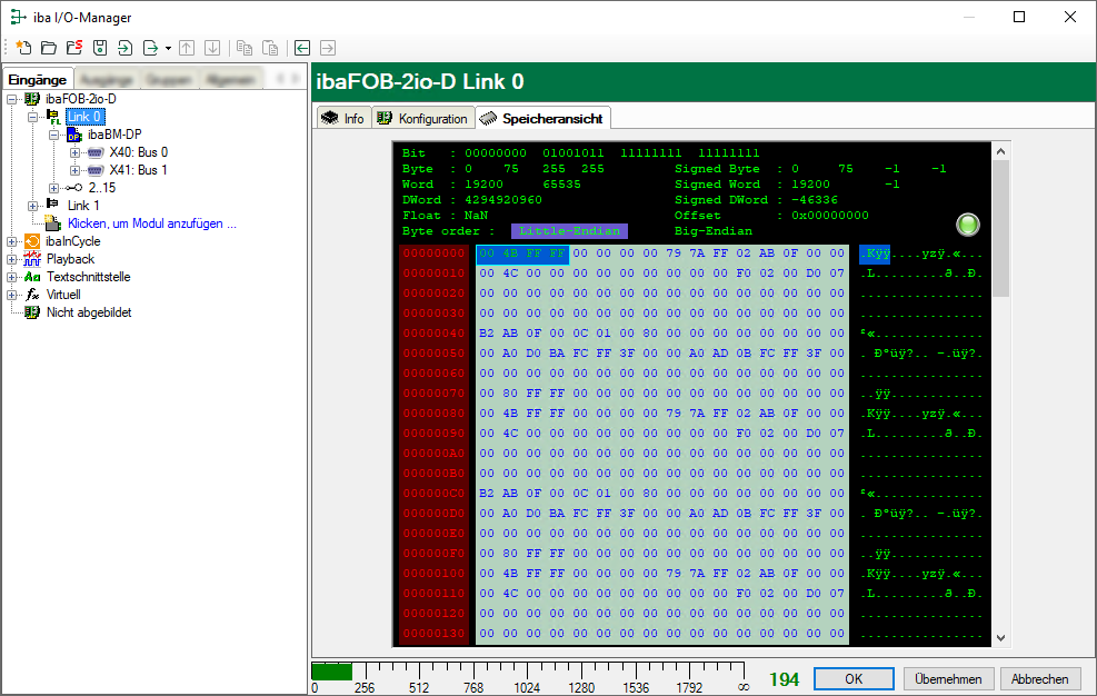 Für den Normalgebrauch wird dieser Dialog nicht benötigt. Ein blinkendes grünes Licht signalisiert ein laufendes System. Die Offset-Adressen sind identisch zu den Angaben in der Spalte Adresse in den Datenmodulen. Hier können Sie herausfinden, mit welchem Format (Swap-Modus) die Daten ankommen. Durch rechten Mausklick können Sie die Adressangabe von Hexadezimal auf Dezimal umschalten und die Anzeige einfrieren.
