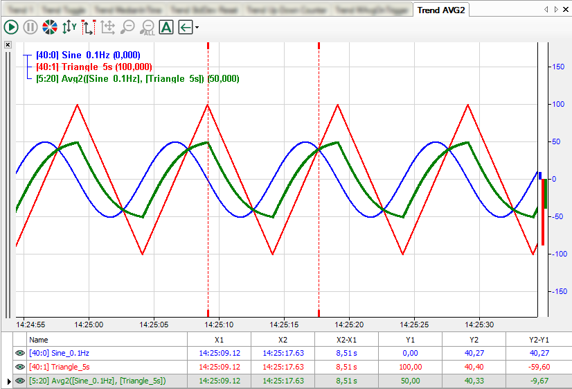 This function returns the average value of all arguments 'Expression1', 'Expression2', 'Expression3' etc. The arithmetic average will be formed from the actual values of all arguments in every acquisition cycle. Up to 1000 arguments are allowed.