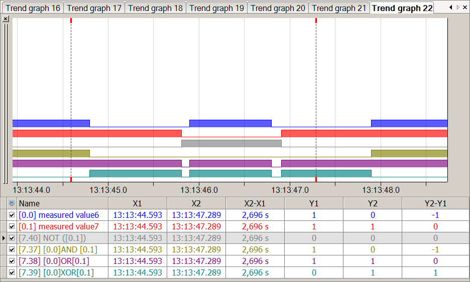 The Boolean functions AND (logical AND), OR (logical OR), NOT (logical NOT, negation) and XOR (logical exclusive OR) can be used to connect binary expressions, such as digital signals. According to the rules of Boolean logic, the functions return the value TRUE or FALSE as their result. Digital signals, calculated (binary) expressions or the numerical values 0 or 1 can be entered as parameters.