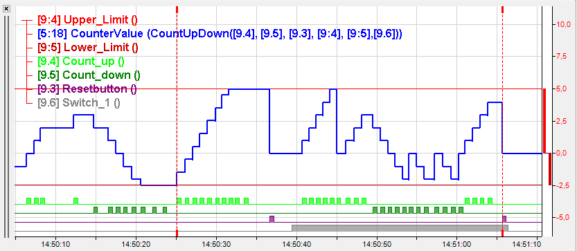 'UpperLimit' and 'LowerLimit' are optional and can be specified either by a fix value or an expression. If limit arguments are specified and the counter reaches a limit, it does not continue counting but stays on the limit value until either a counter pulse in the other direction occurs or 'Reset' is set to TRUE.