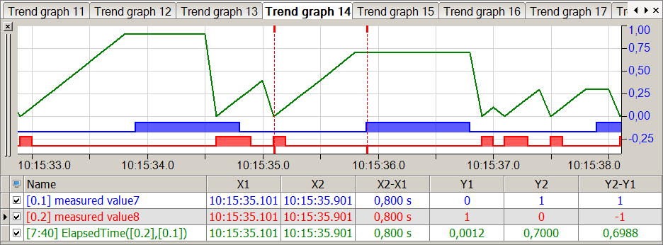 By switching the edges in the sampling grid, the graphic presentation and calculation of the elapsed time may differ by one sample. |