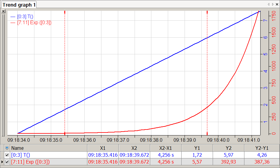 In the figure below the blue curve shows the time function and the red curve shows the exponential function of time.
