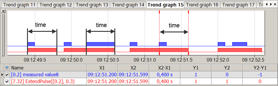 In the figure below the blue bar shows the measured value and the red bar shows the extended pulses of the measured value.