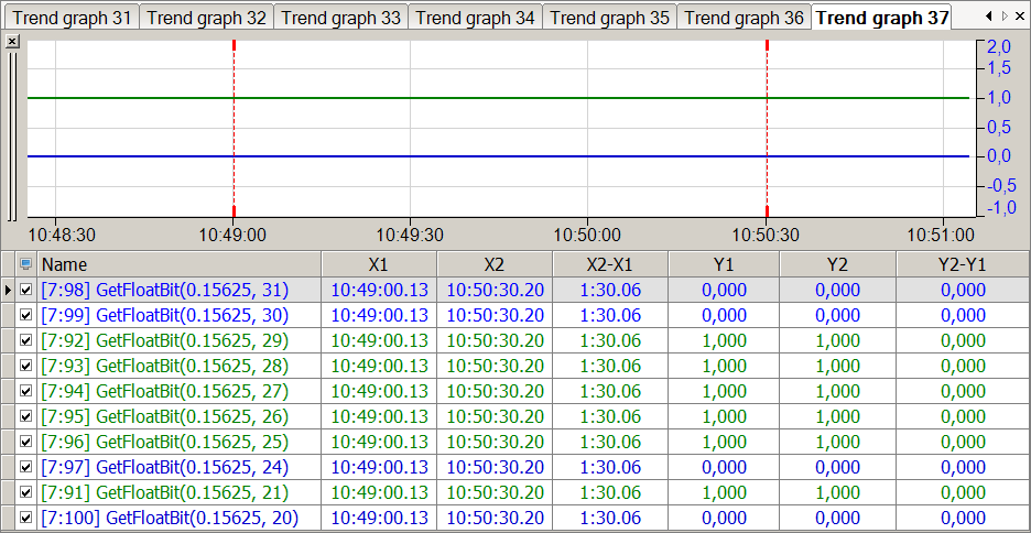 Diese Funktion wurde speziell für den Fall entwickelt, wenn 32 Bits für die Übertragung/Aufzeichnung als Float-Daten gepackt werden. Die Funktion GetBitFloat wertet lediglich die Valenz des spezifizierten Bits 'BitNo' aus, ungeachtet dessen, ob es Teil der Mantisse oder des Exponenten ist. Im Gegensatz zur Funktion GetBit werden die Werte nicht gerundet.