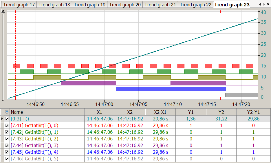 Die nachfolgende Abbildung zeigt die Funktion GetIntBit der ersten sechs Bits der Zeitfunktion T().