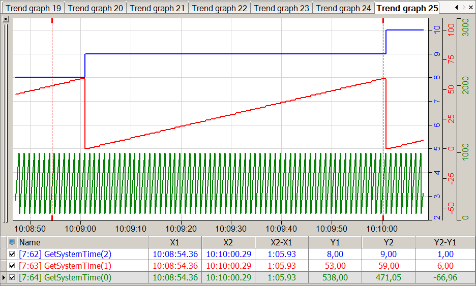In the figure below the blue curve shows the minutes of the system time ('part' = 2) and the red curve shows the seconds of the system time ('part' = 1). The green curve shows the milliseconds of the system time ('part' = 0).