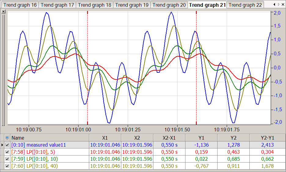 Applying the filter function to a sine wave with 10 Hz, which is overlaid by a further wave with 50 Hz.