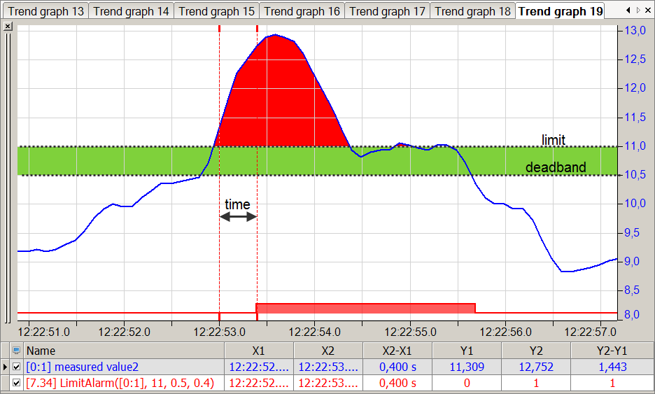 In the figure below the blue curve shows the measured value and the red bar shows when the limit is exceeded. The green band shows the dead zone that prevents a direct FALSE setting of the function.