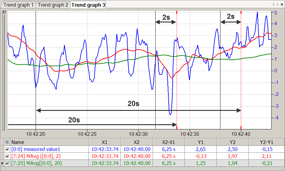 In der nachfolgenden Abbildung zeigt die blaue Kurve den Messwert, die rote Kurve zeigt den Mittelwert über ein Intervall von zwei Sekunden und die grüne Kurve zeigt den Mittelwert über ein Intervall von 20 Sekunden.