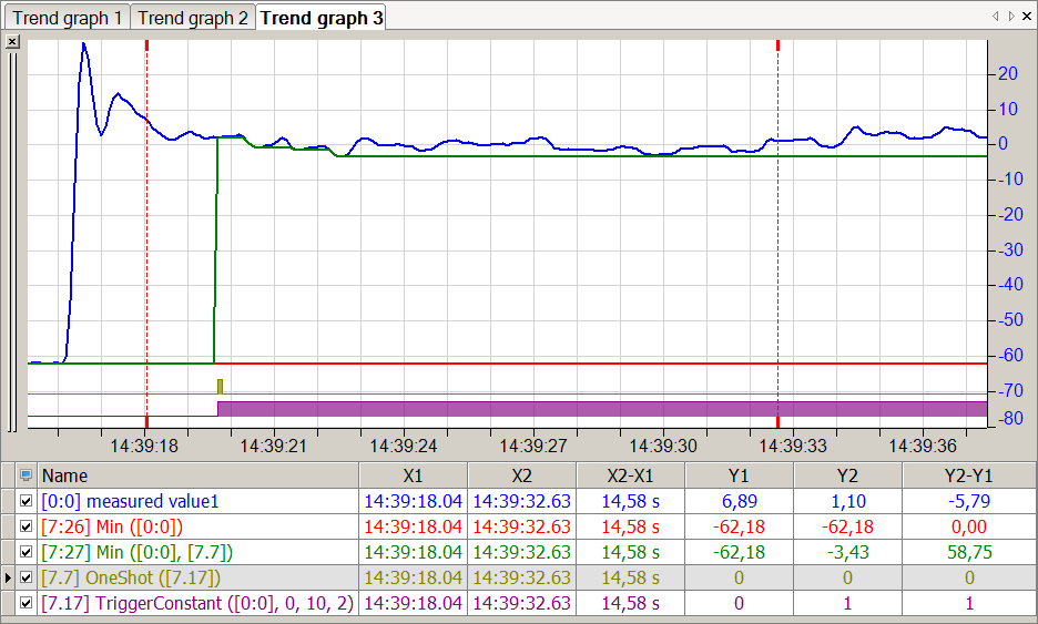 In order to remove fluctuations during the start phase, the minimum value is reset using the 'reset' function. This can be done via the TriggerConstant function, which waits for the leveling off of the signal. The setting of the 'reset' parameter is done via the edge detection ('OneShot') of the trigger.