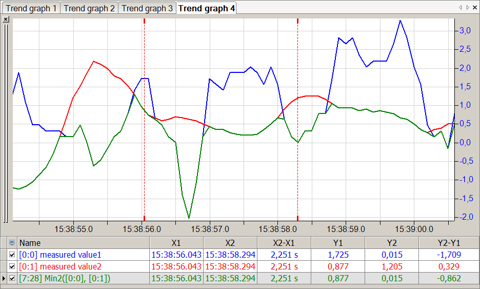 In the figure below the blue curve shows the measured value 1, the red curve shows the measured value 2, and the green cure shows the course of the minimum values.