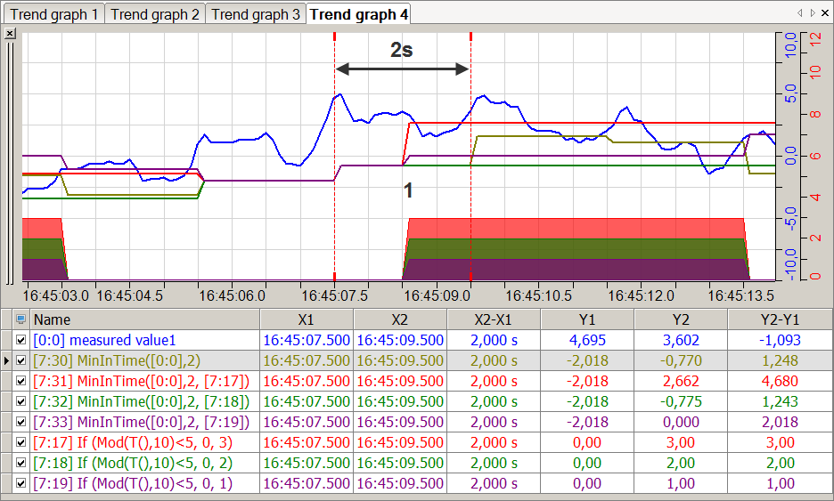 Diese Funktion liefert als Ergebnis das Minimum von 'Expression' innerhalb jedes Intervalls der Länge 'Interval' (in s).