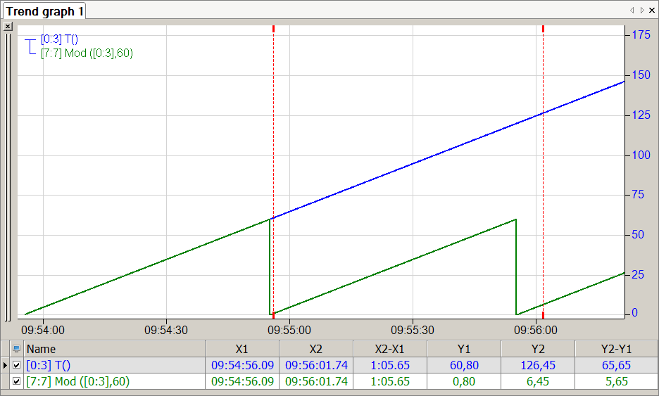 In the figure below the blue curve shows the time function and the green curve shows Modulo60 of the time function.
