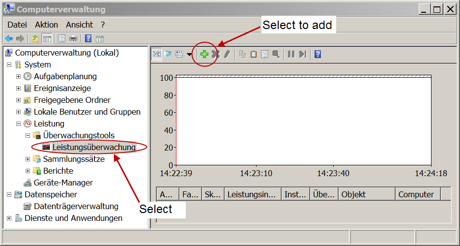 Um die Leistungsmerkmale, die überwacht werden sollen, unter Windows 7 auszuwählen, drücken Sie die Windows-Taste und suchen Sie nach Computerverwaltung. Anschließend müssen sie auf der linken Seite unter System – Leistung – Überwachungstools den Punkt Leistungsüberwachung auswählen. Mit dem grünen +-Symbol in der oberen Leiste können Sie zu überwachende Leistungsmerkmale hinzufügen.