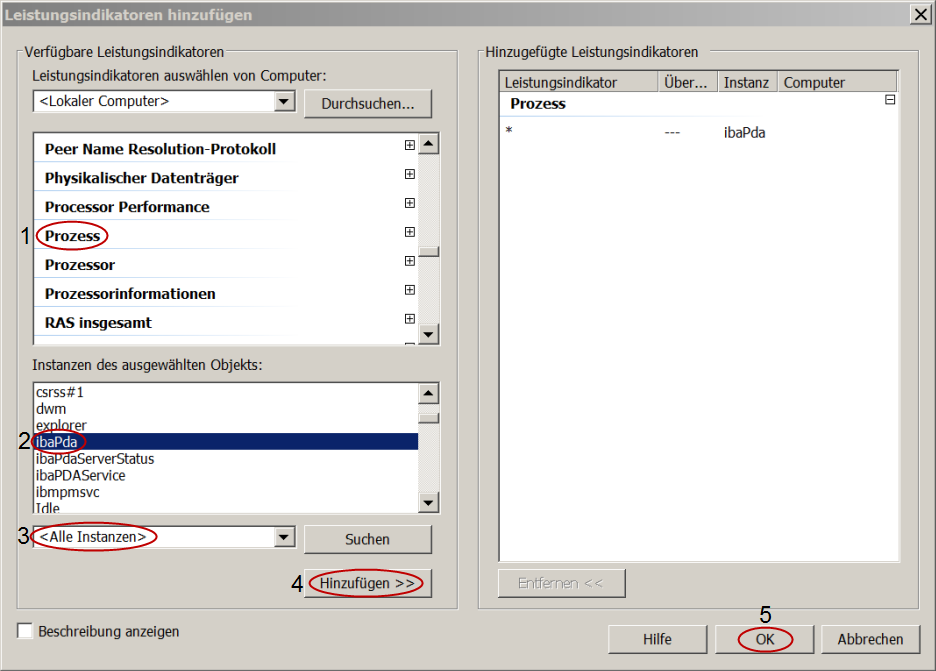 Wählen Sie die Leistungsindikatoren und anschließend die Instanzen aus. In diesem Fall wird Prozess, ibaPDA und Alle Instanzen ausgewählt, anschließend mit <OK> bestätigt. In der folgenden Abbildung sind die Schritte markiert und nummeriert.