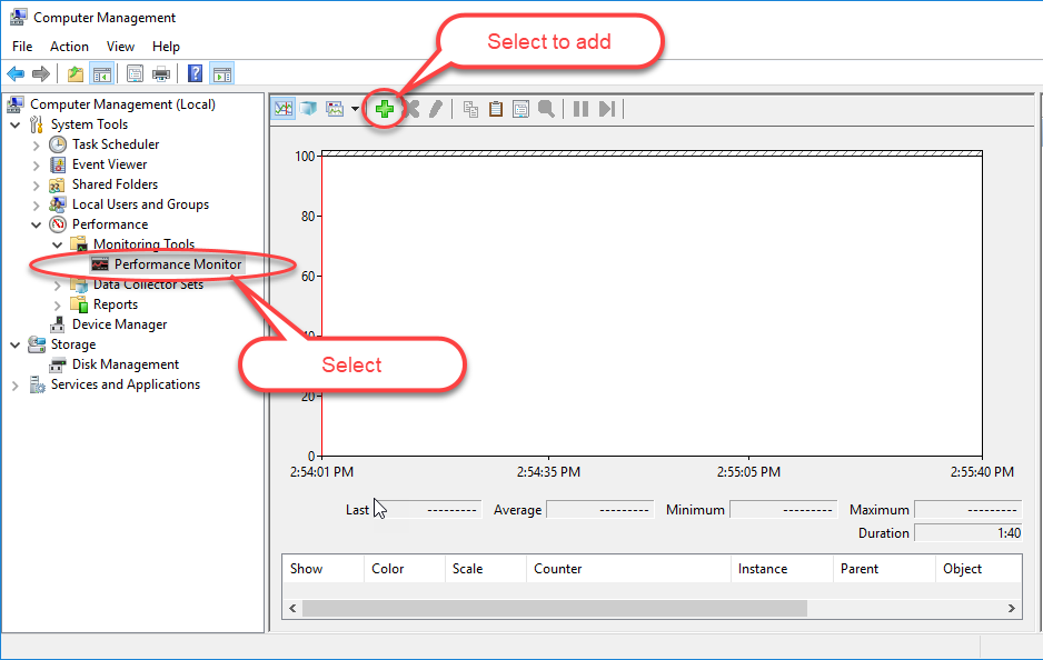 In order to select the performance characteristics that should be monitored under Windows 7, click on the Windows icon and search for Computer Management. Then on the left side under System – Performance – Monitoring tools you need to select the item Performance monitoring. You can add performance characteristics to be monitored with the green +- symbol in the top bar.