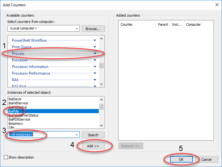 Select the performance indicators and then the instances. In this case, process, ibaPDA, and all instances are selected, then added and confirmed with <OK>. In the following illustration, the steps are marked and numbered.