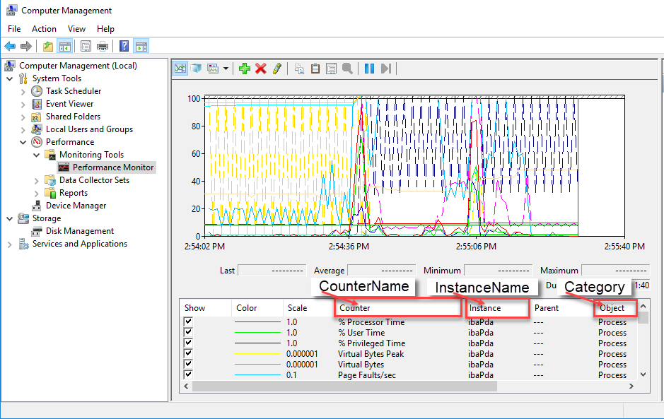 The allocation to individual function arguments by PerformanceCounter is illustrated in the next illustration. You must accurately enter the names of the individual performance indicators, objects and instances for the entry in ibaPDA.