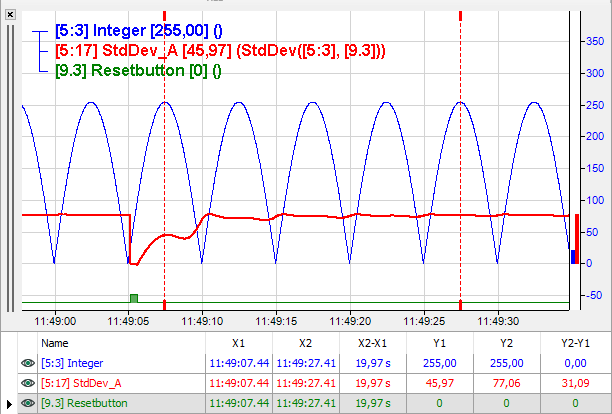 This function returns the standard deviation of 'Expression' as its result. If 'Reset' is TRUE the result is reset to 0.
