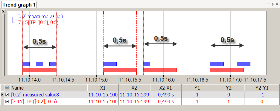 In the figure below the blue bar shows the measured value and the red bar shows the output value in 0.5 second pulses.