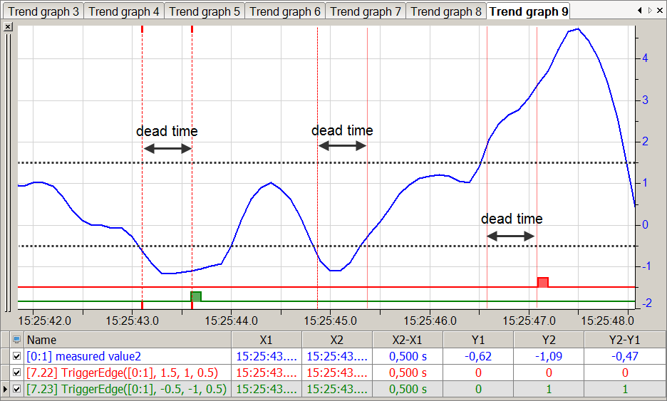 In der nachfolgenden Abbildung zeigt die blaue Kurve den Messwert und der rote Balken zeigt den Trigger, wenn der Messwert länger als 0,5 Sekunden über 1,5 ist. Der grüne Balken zeigt den Trigger, wenn der Messwert länger als 0,5 Sekunden unter -0,5 ist.