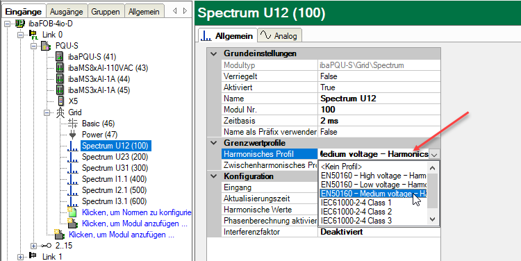 Das Grenzwertprofil ist im I/O-Manager in den Spectrum-Modulen konfiguriert. Der Name des Profils lautet "EN50160 – Medium voltage – Harmonics".
