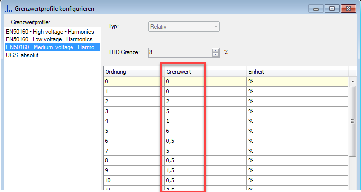 Die Grenzwerte können mit Profile konfigurieren eingesehen werden. In unserem Beispiel liegt der Grenzwert für die 3. Harmonische bei 5 %.