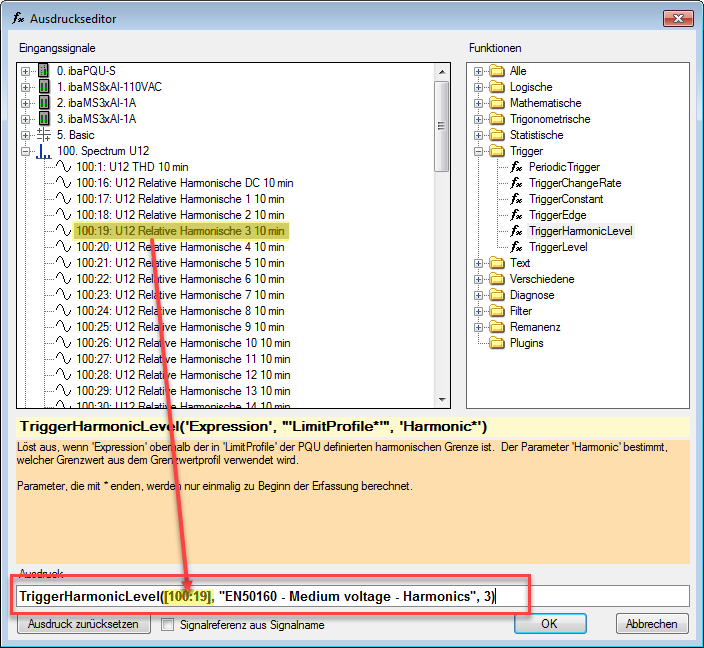 Bei einer Messung an einer Mittelspannungsschaltanlage soll die Leiterspannung U12 auf ihren Oberschwingungsgehalt überwacht werden. Bei Überschreitung des nach EN50160 vorgeschriebenen Grenzwerts für die 3. Harmonische im 10 min-Intervall soll ein Triggersignal ausgelöst werden.
