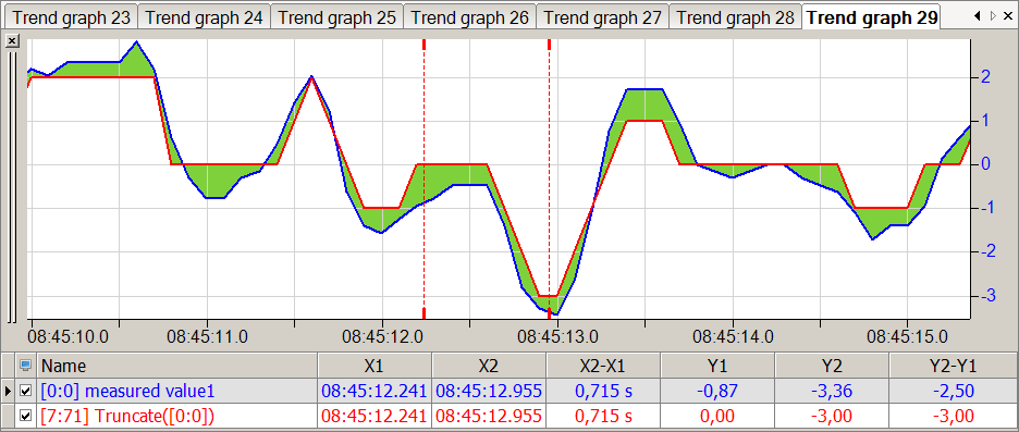 In der nachfolgenden Abbildung zeigt die blaue Kurve das ursprüngliche Signal und die rote Kurve zeigt den Signalverlauf mit abgeschnittenen Nachkommastellen.