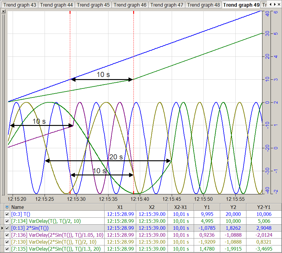 The time function T() is used as the variable delay. This and a sine signal are set to this variable delay and the resulting curves are recorded.