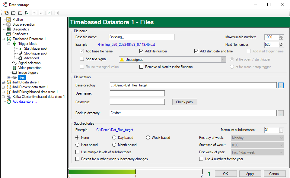 Naming and administration of data files must be configured prior to the first recording. In order to configure these settings, click on the "Files" sub-branch of the corresponding data storage in the data storage dialog. On this level, you can configure file name and storage location.