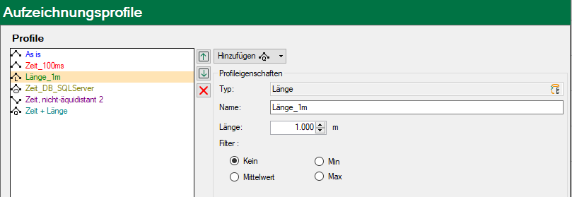Dieser Profiltyp dient der Aufzeichnung von Messwerten in einer längenbasierten ibaHD-Aufzeichnung. Hiermit legen Sie fest, in welchen Abständen (Meter) Messwerte in eine ibaHD-Aufzeichnung geschrieben werden. Die Umrechnung der Messwerte auf Längenbasis wird in der Definition der ibaHD-Datenaufzeichnung konfiguriert.