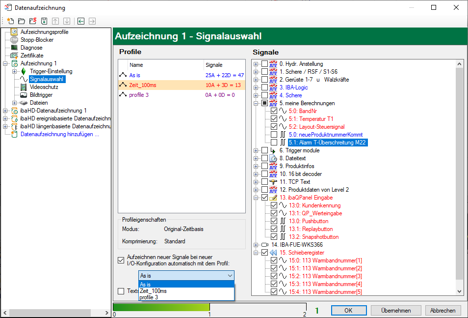 In dem rechten Teil des Dialogfensters sind die zur Verfügung stehenden Aufzeichnungsprofile aufgelistet. Weiter rechts befindet sich der Signalbaum mit allen verfügbaren, d. h. aktivierten Signalen. Nur die hier sichtbaren Signale können einem Aufzeichnungsprofil zugeordnet werden.