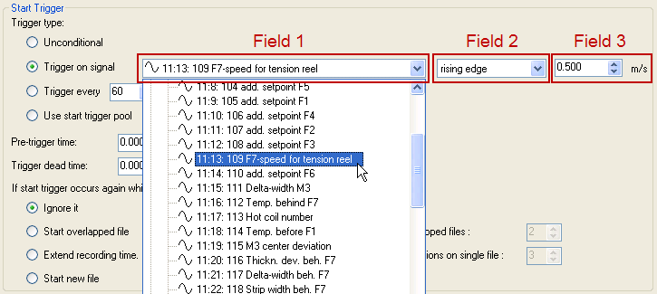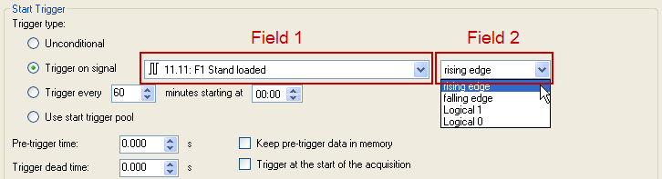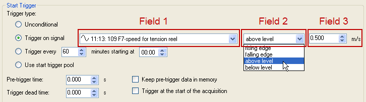 Field 3 Dropdown list for selecting the trigger level value given in the specific physical unit (field 3 is only enabled in case of analog trigger signals)