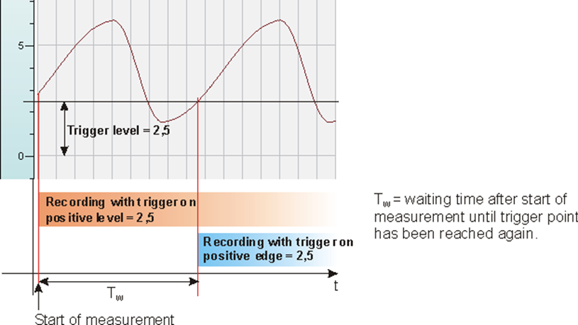 Care must be taken when using trigger edges! In order for a trigger to fire at a positive or negative edge, the value specified in field 3 must be at least slightly exceeded or fallen below. Otherwise, no trigger will occur. Therefore, it is often more useful to define a level trigger, which fires as soon as the signal reaches or exceeds/falls below the level defined in field 3. If this is the case already at the time the measuring starts, the recording will start immediately. The diagram shows the differences between the recording starts, which might occur depending on the trigger conditions and the time the measurement starts.