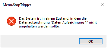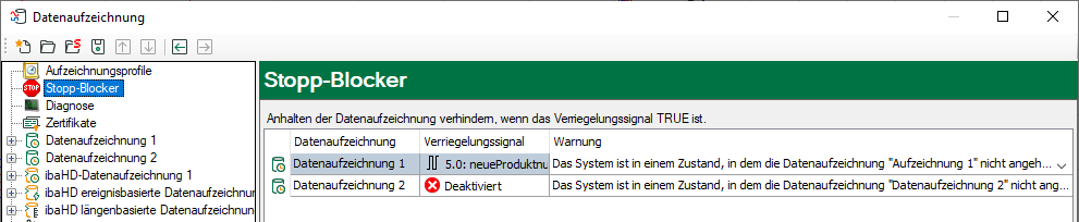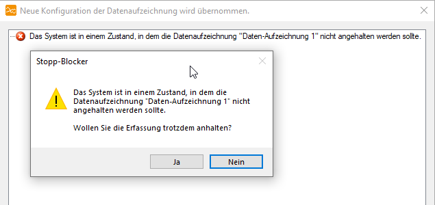 Wenn der Stopp-Blocker durch eine Änderung der Datenaufzeichnungskonfiguration anspricht, dann erscheint die Warnmeldung und zusätzlich ein Eintrag im Validierungsdialog.
