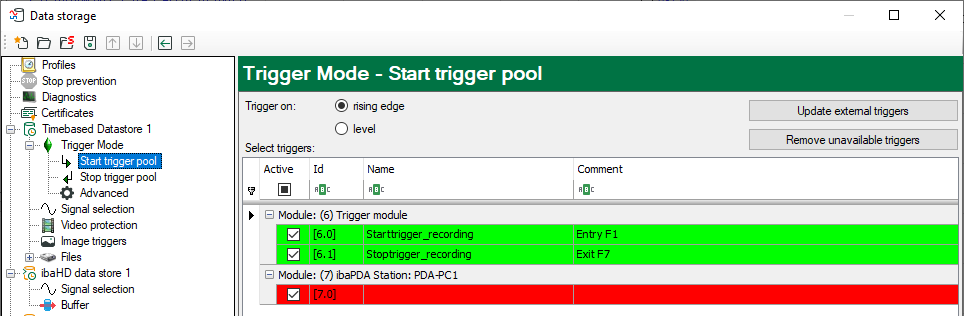 You will find the configuration dialog for start and stop trigger pools under the “Trigger mode” branch in the tree structure of each data storage.