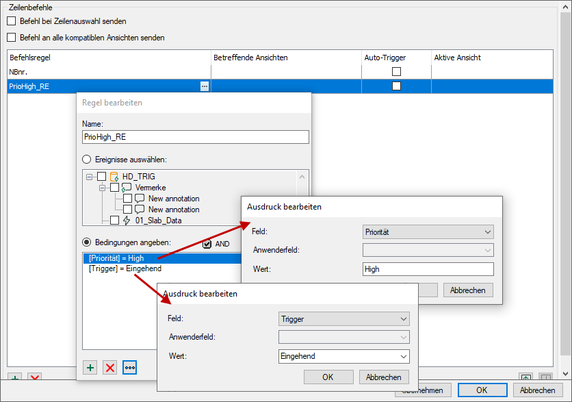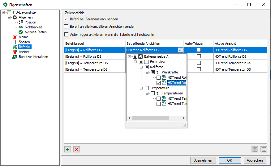Wenn Sie für eine Befehlsregel in der Spalte Auto-Trigger ein Häkchen machen, dann erfolgt die Umschaltung der Ansicht sogar automatisch bei Eintritt der konfigurierten Bedingung.