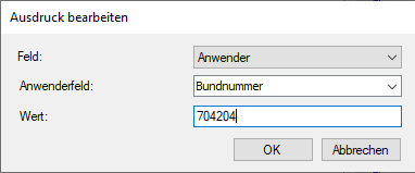 Mit diesem Ausdruck würde z. B. bei einem Doppelklick auf ein Ereignis geprüft, ob es ein Zahlen- oder Textfeld mit der Bezeichnung "Bundnummer" hat und ob dies gleich dem Wert "704204" ist.