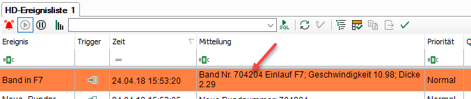 Im folgenden Beispiel wird bei Doppelklick auf Ereignisse die HD-Trendkurve mit dem Namen "Walzkräfte" gestoppt und auf den Zeitstempel des angeklickten Ereignisses gesetzt. Die Ereignisse erfüllen folgende Voraussetzungen: