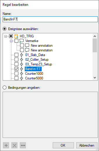 Wenn Sie die Option Bedingungen angeben aktivieren, dann können Sie in dem Feld darunter Prüfbedingungen formulieren, die bei Doppelklick auf eine Ereigniszeile ausgeführt werden. Im Auto-Trigger-Modus werden die Bedingungen ständig abgeprüft.