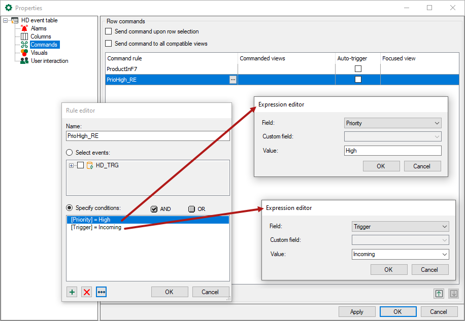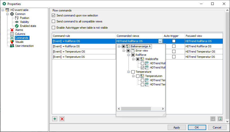 If you want all HD trend graphs to jump to the time of the event that you have double clicked, then enable the option Send command to all compatible views. The command rules will be disabled in this case.