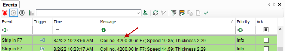 In the following example, double-clicking on events stops the HD trend graph named "Rolling forces" and sets it to the time stamp of the clicked event. The events meet the following requirements: